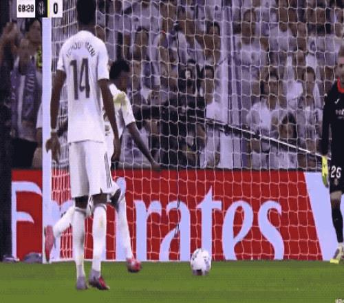 20分钟后,极为活跃的维尼修斯突入禁区,和马林对抗后倒地,裁判判罚点球。维尼修斯希望主罚,姆巴佩让贤,成全了维尼修斯的梅开二度。