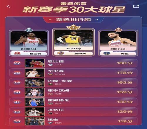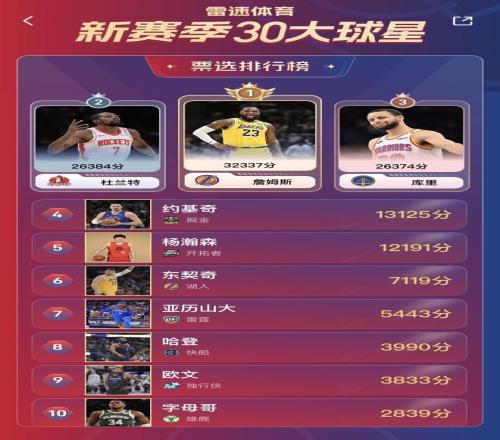截至北京时间10月19日14:00,詹姆斯、杜兰特、库里三人领跑排名。其中,詹姆斯以32337票遥遥领先,几乎已经坐稳头名。而第二名的争夺则异常激烈!杜兰特今日以26384的票数反超库里位列第二,库里则以26374的票数位列第三,二人之间的差距微乎其微!第4、5名之间的差距同样不大,开拓者球员杨瀚森断层领先第六名东契奇,距离第四名约基奇仅相差934票!