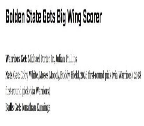 篮网得到:科比怀特+穆迪+希尔德+26年勇士首轮+28年勇士首轮;