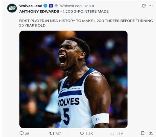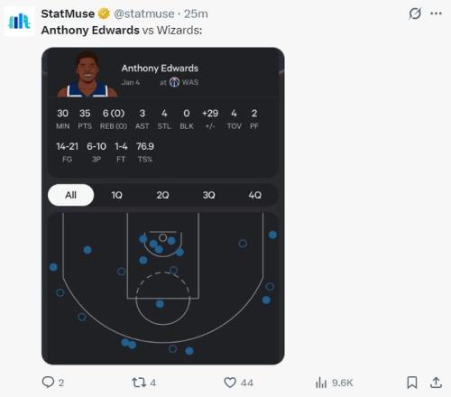 北京时间1月5日,森林狼141-115大胜奇才拿到二连胜。这场比赛森林狼在客场碾碎了奇才,首节森林狼就领先10分,第三节更是一波35-21直接将比赛打入垃圾时间,狼王爱德华兹三节35分打卡下班,不过此役爱德华兹在赛后遭到了一些质疑。