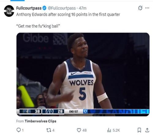 但赛后美媒Fullcourtpass解读了在爱德华兹首节拿到16分后他的口型,他朝着队友狂喷:把那该死的球给我,FUXKing。。。。。。(他这个性格的确有些问题,此前对阵老鹰末节被打崩后他直接进入更衣室也遭到质疑)