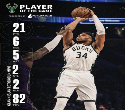 雄鹿队超级巨星扬尼斯阿德托昆博,在此役表现高效,迎来了暴走。字母哥出战31分钟,11投9中,没有3分球出手,罚球4中3,轰下了21分6篮板5助攻2抢断2盖帽的全能数据,正负值+6高居全队第二。字母哥没有远投出手,专注于冲击篮下。此战,字母哥仅仅投丢2球,有着81.8%的极高命中率。并且,字母哥此战仅仅只罚丢了1球。得到了全队第二高分的字母哥,在进攻端效率极高。