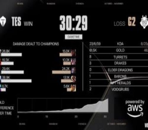 体育资讯10月30日称 S15八强TES首局击败G2,JKL韦鲁斯首局打出了38.9W的伤害。